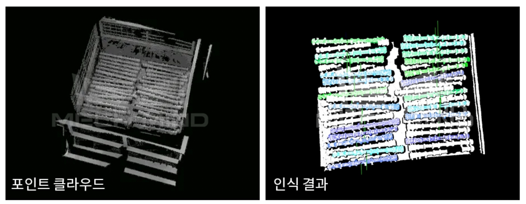 2. 깊고 밀집하여 적재된 빈(bin) 안에서 어두운 표면과 복잡한 형상을 가진 길고 가는 캠샤프트를 정확하게 인식합니다.